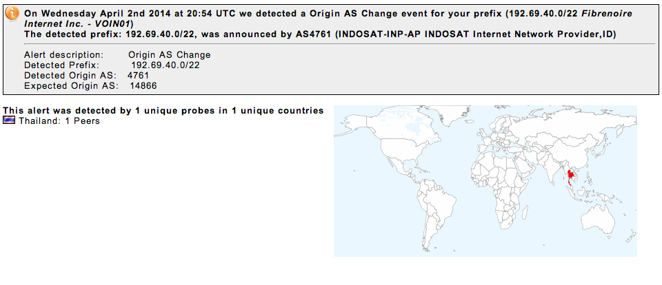 Yesterday afternoon, starting at 2:05PM local time, I received several notices about our prefixes being hijacked – announced by an ASN other than our own. The particular ASN that was advertising the prefixes in question was AS4761, Indosat, an Indonesian satellite Internet provider.