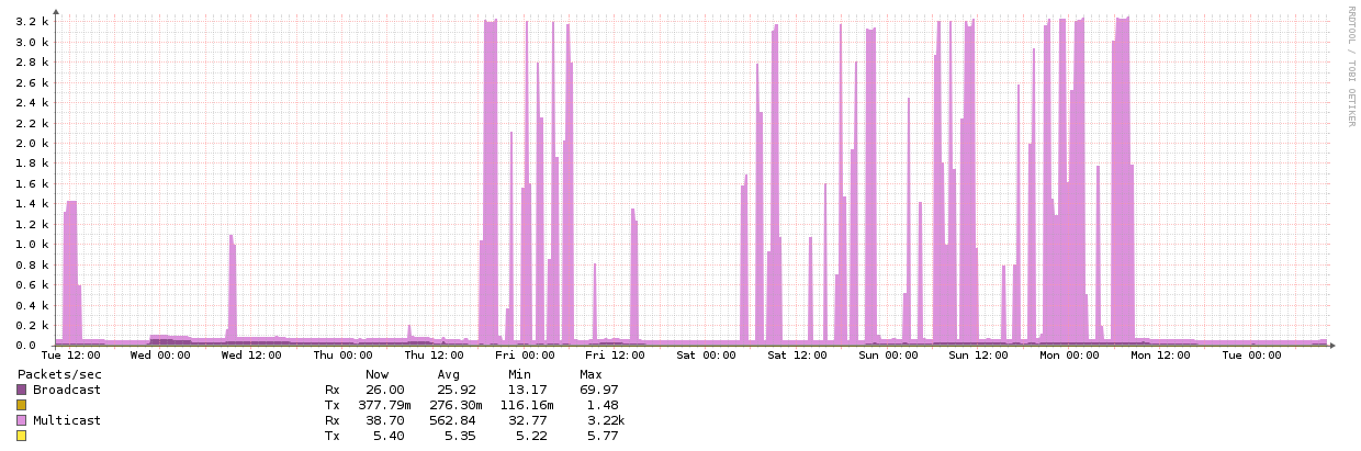 The problem started early on a Friday morning – reports of dropped internal/external calls, as well as both LAN and internet outages. I wasn’t in the office when the problem was happening, so I didn’t get a packet capture of the event. Looking at my Observium graphs, it was soon obvious that some kind of Multicast packets were the culprit. This switch was seeing about 3300 packets/sec worth of Multicast packets.