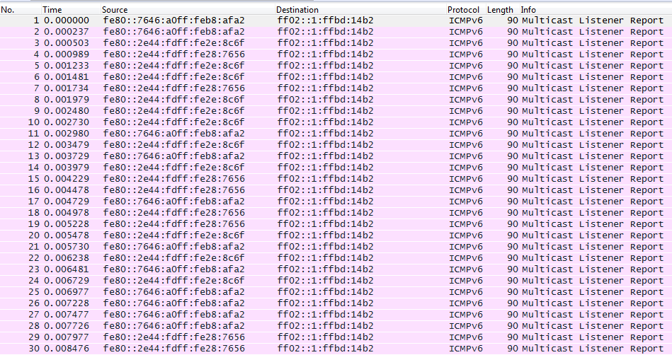 Near the end of the day I was rewarded with a giant capture file when the next report came in, about 2:20PM. I tore into the capture file with Wireshark and quickly discovered 3 machines were flooding the network with IPv6 Multicast Listener Reports.